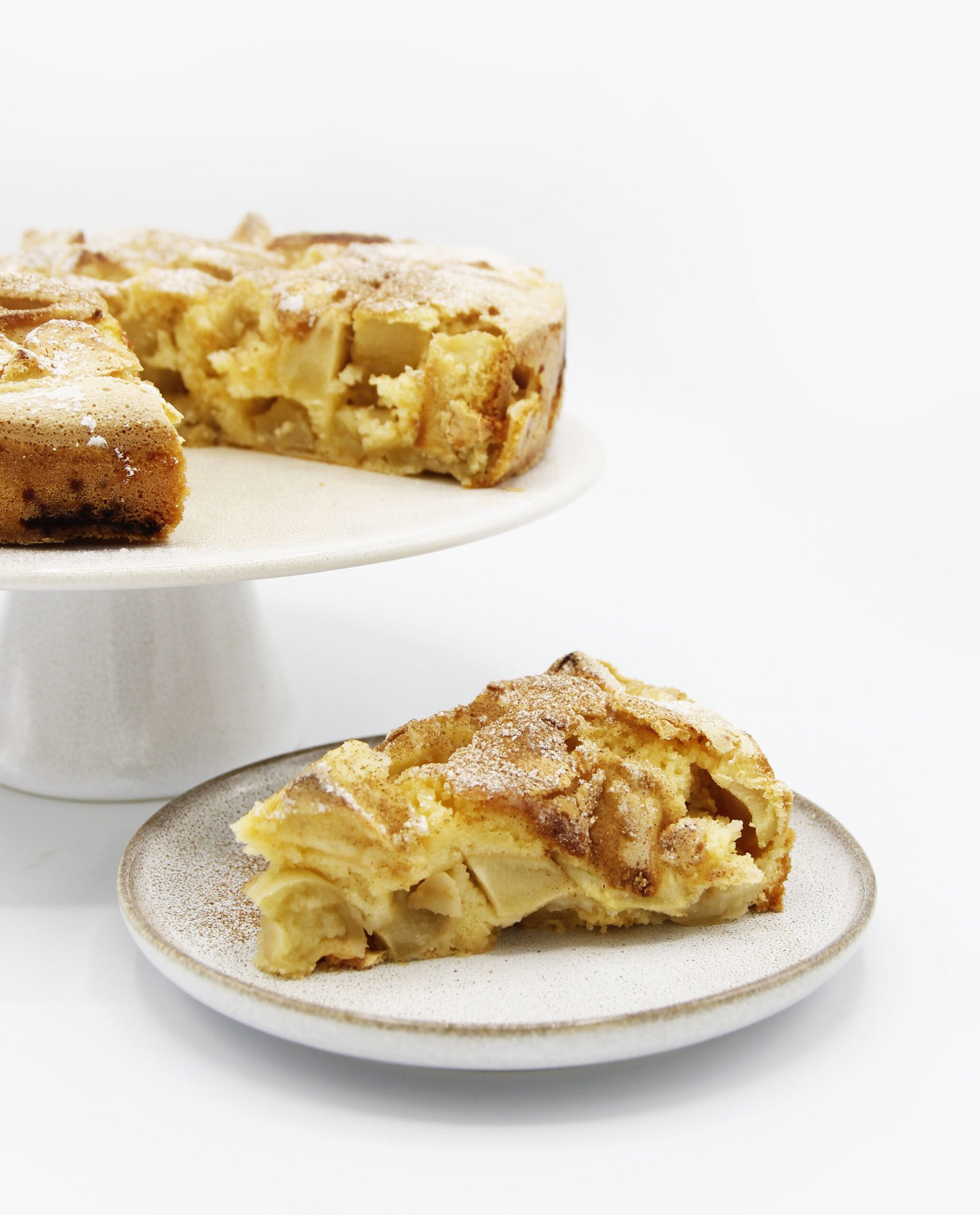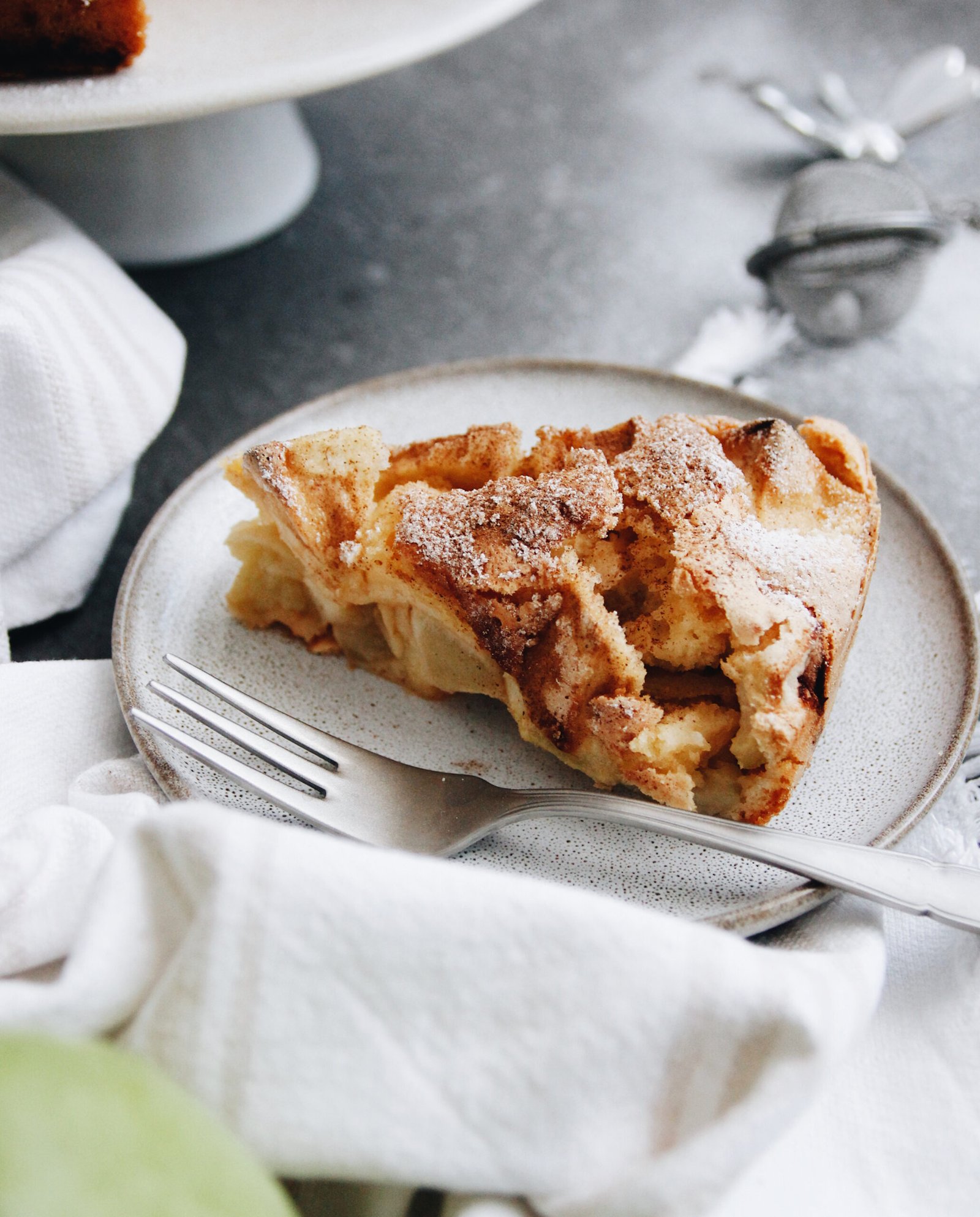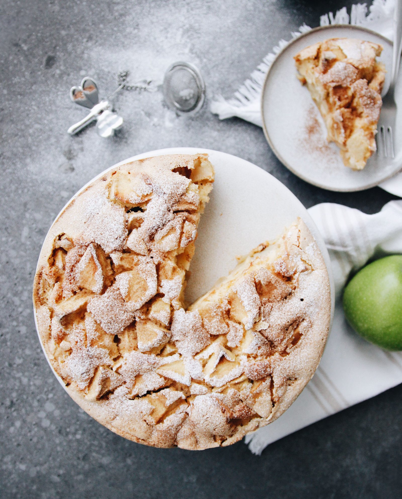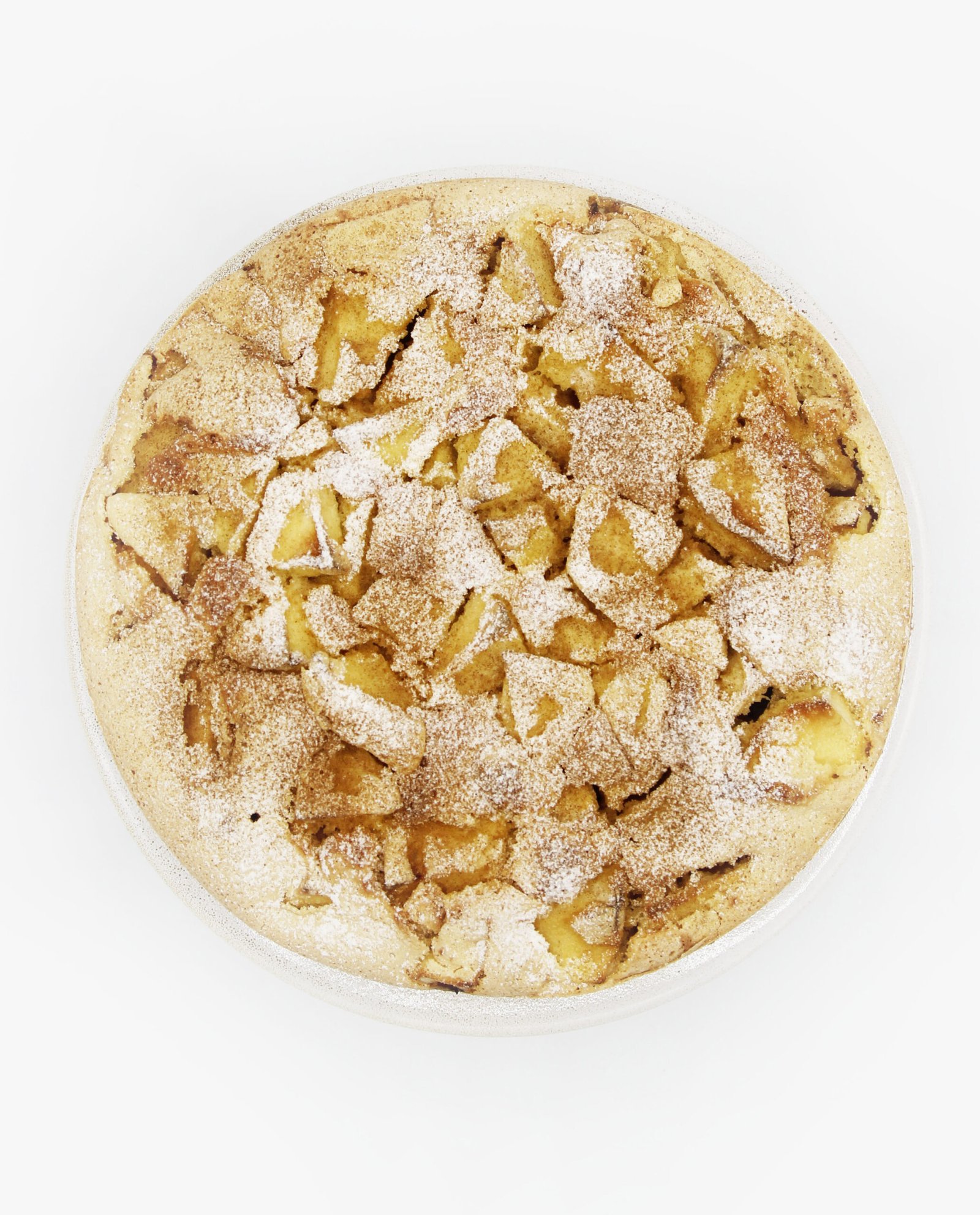 Mollë të freskëta jeshile prerë në kubikë dhe mbuluar me një brum të hollë me vezë sa për të bërë lidhjen e mollëve. Pluhurosur sipër me kanellë të bluar.