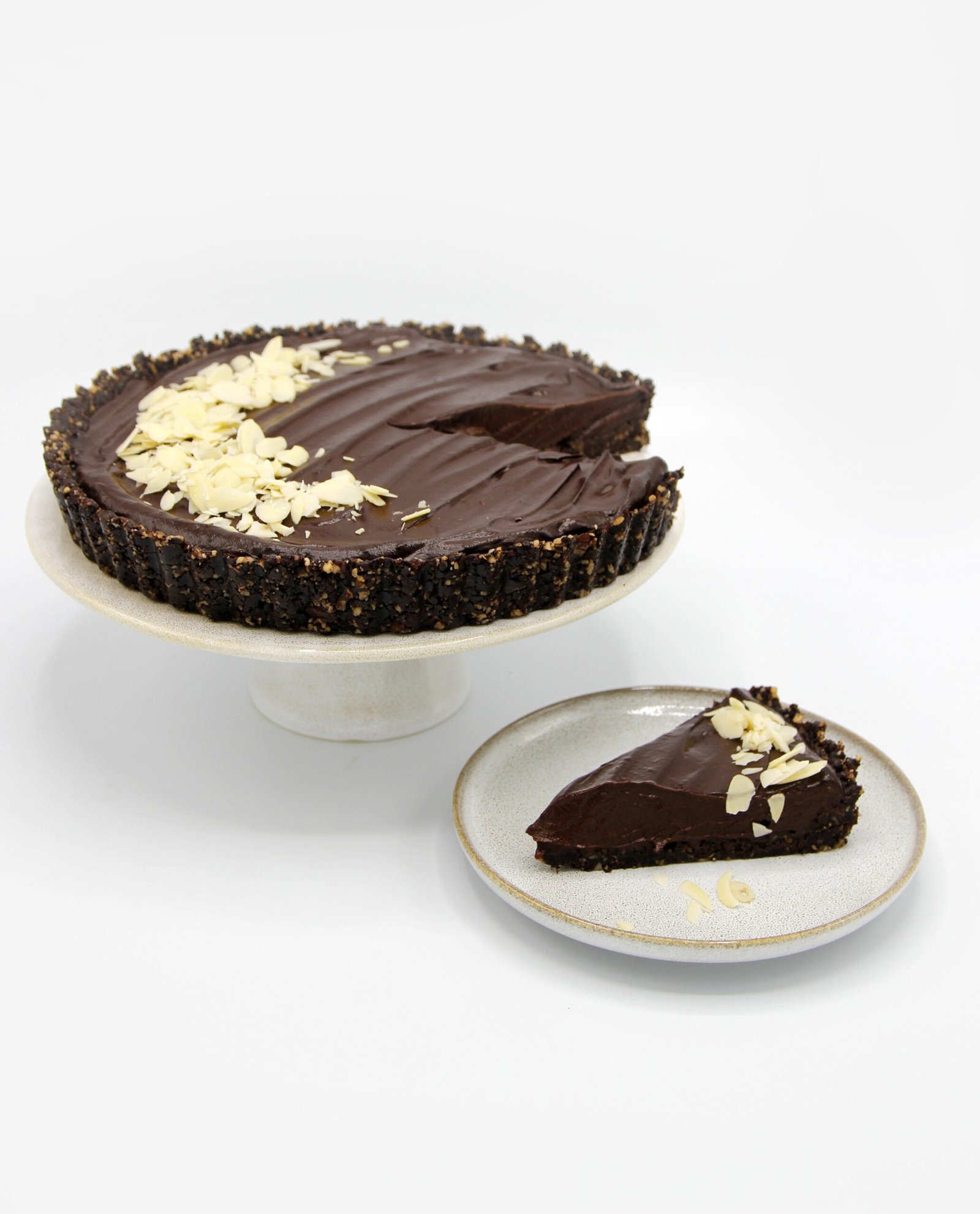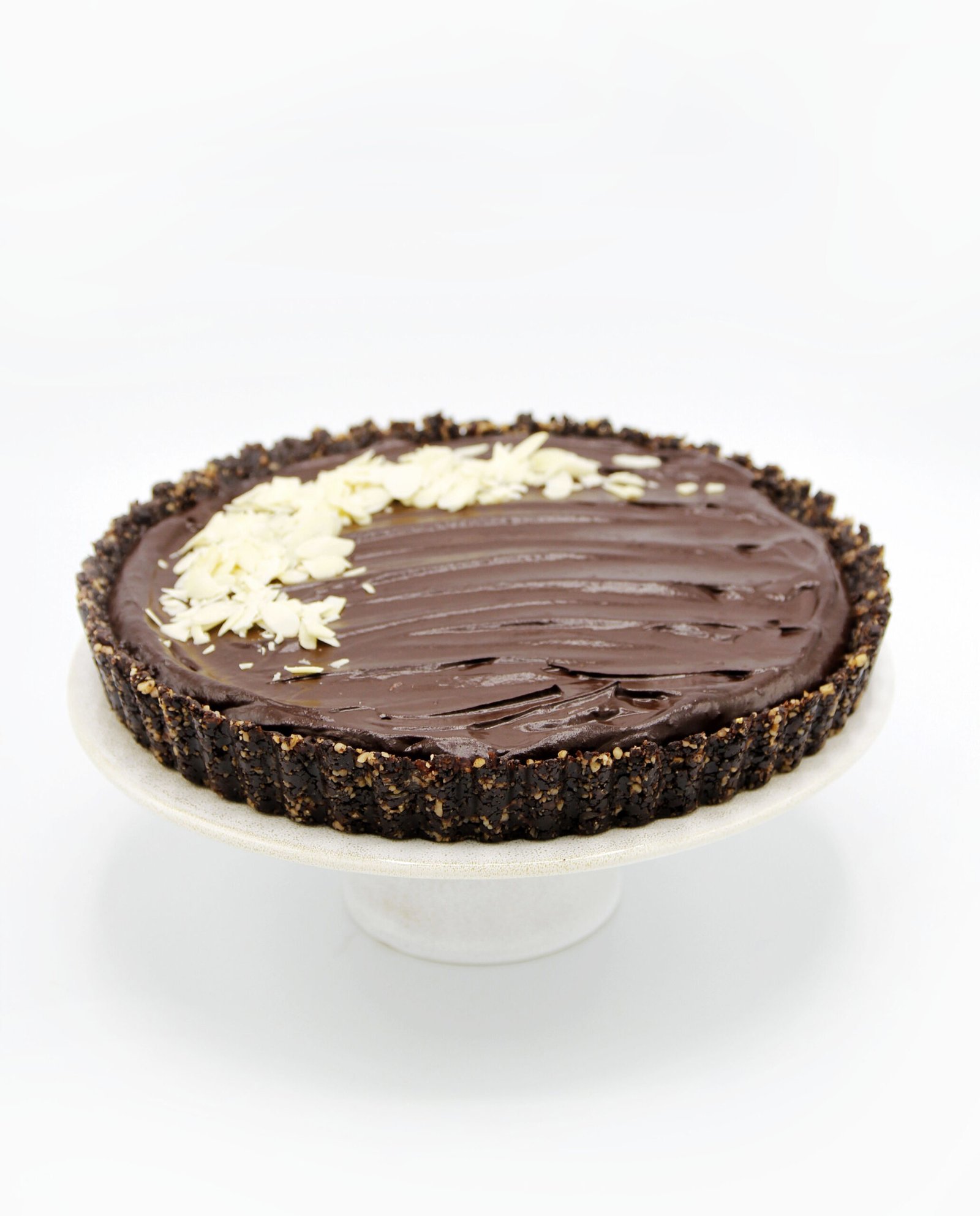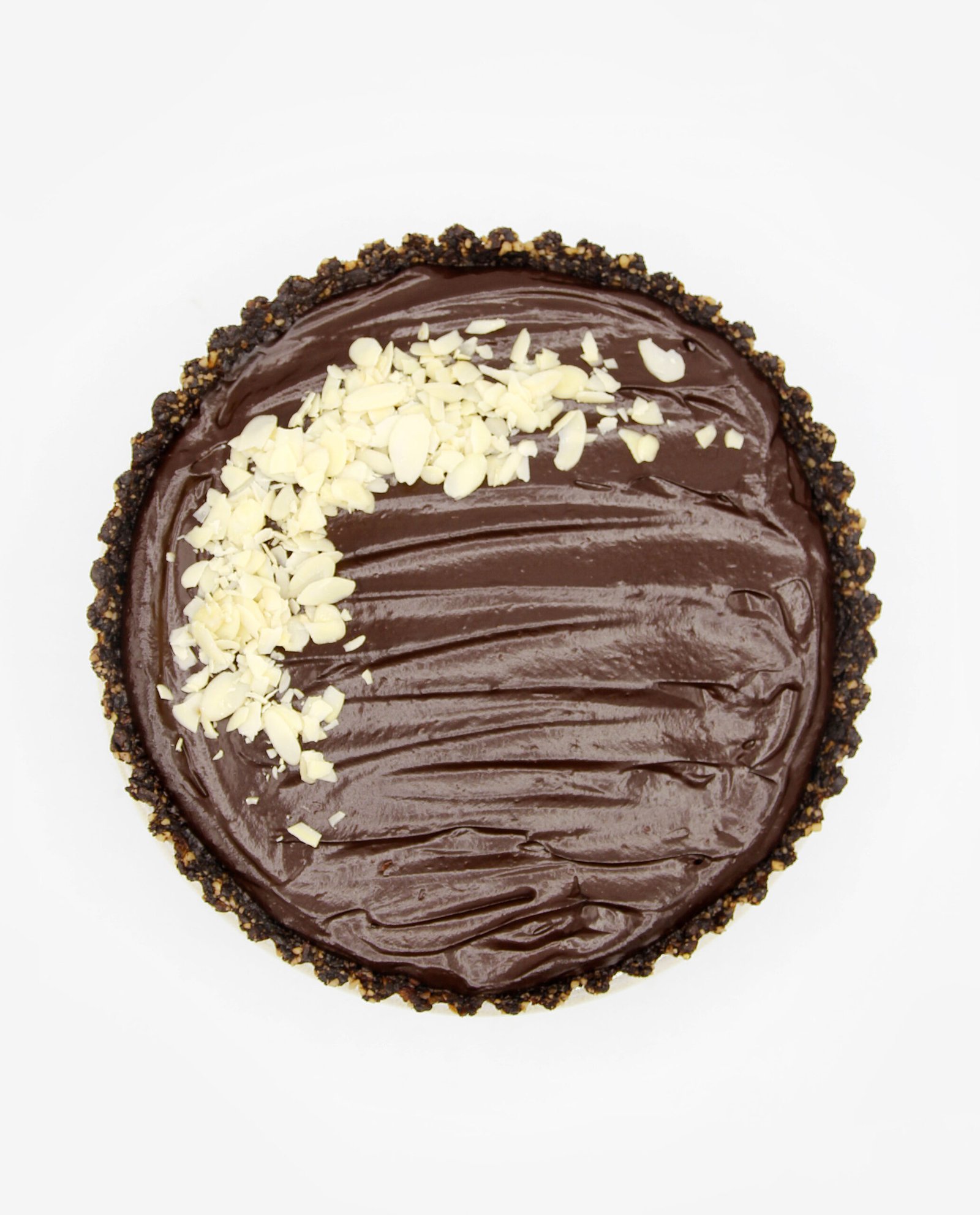 Baza e tartës me një përbërje: hurma arabie, arra e kakao dhe mbushja e kremit të çokollatës me ëmbëlsues natyral, avokado, qumësht bajamesh e kakao. Dekoruar me fletë bajameje.