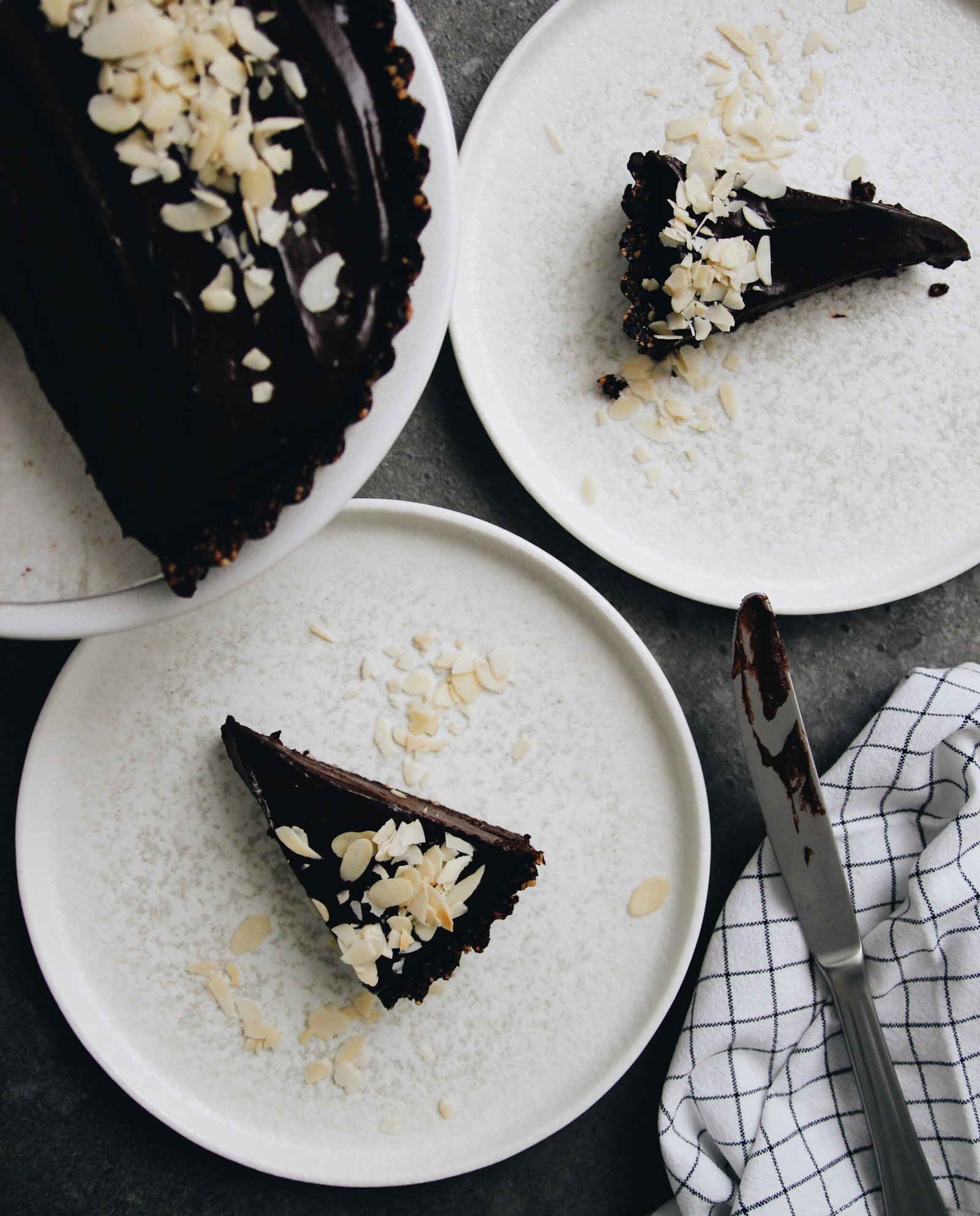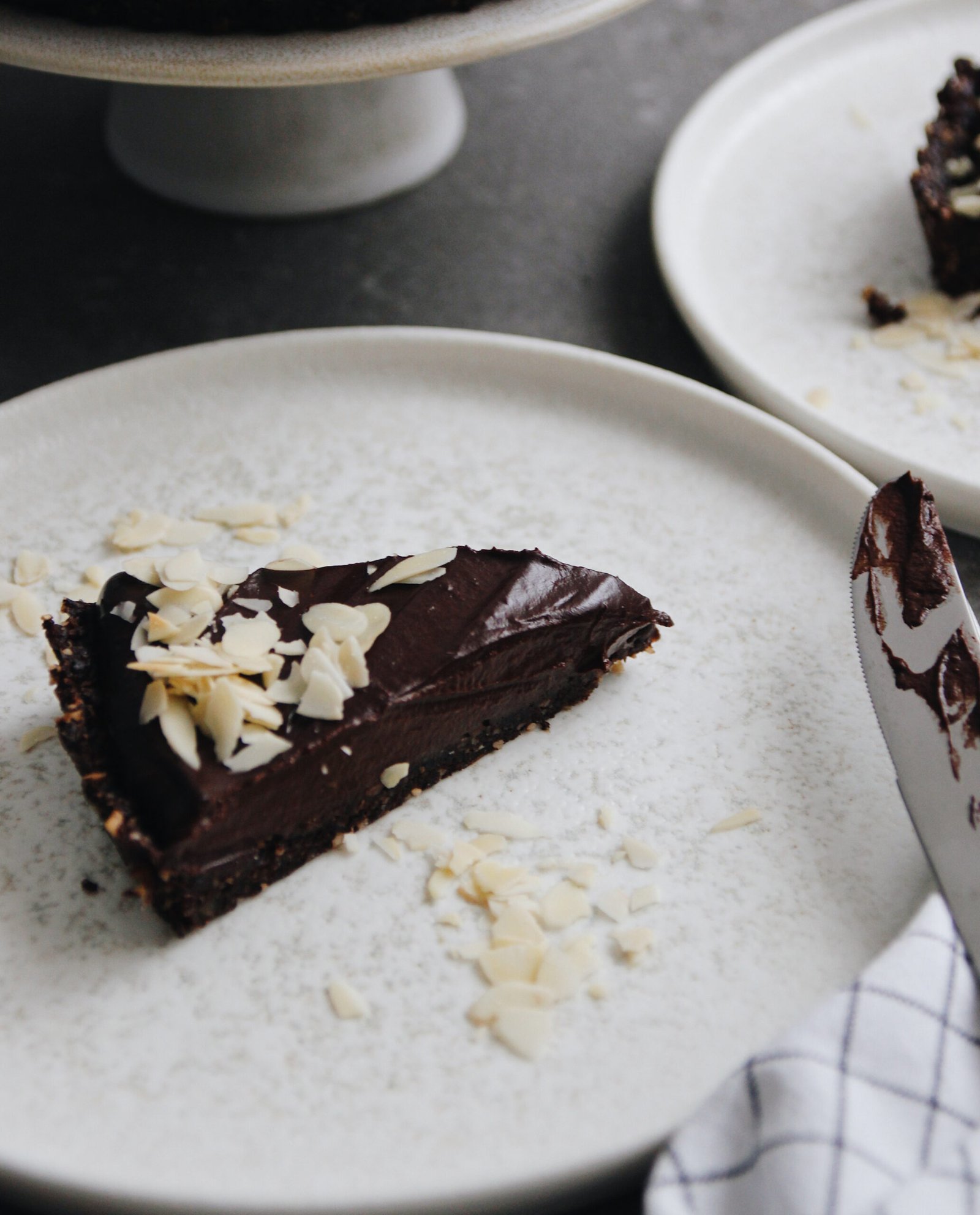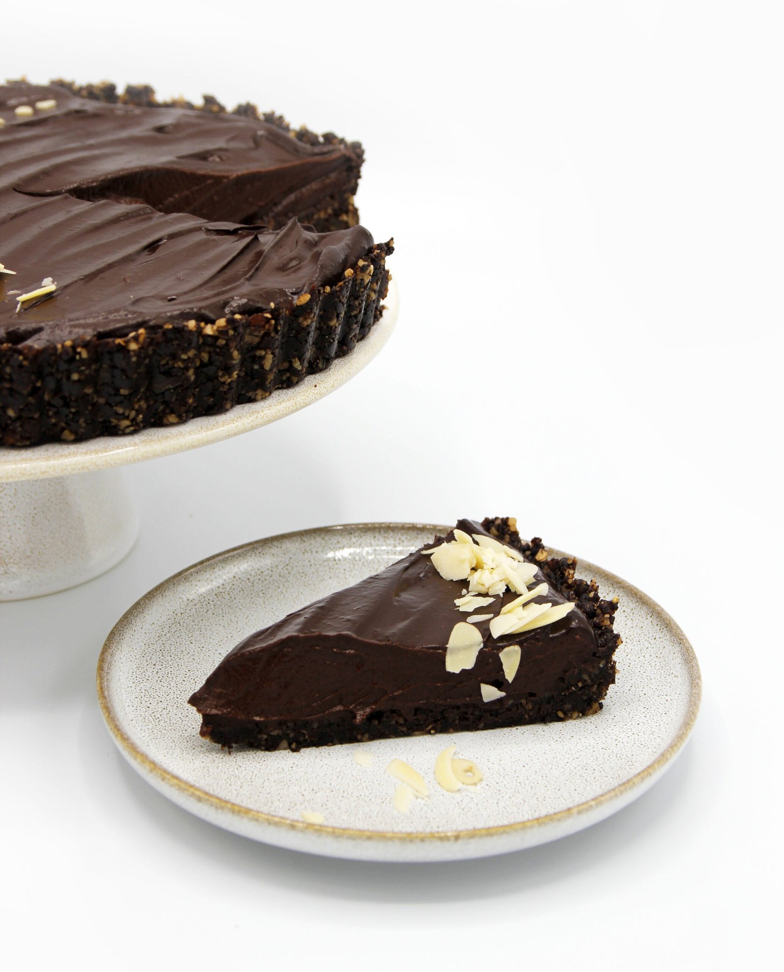 Baza e tartës me një përbërje: hurma arabie, arra e kakao dhe mbushja e kremit të çokollatës me ëmbëlsues natyral, avokado, qumësht bajamesh e kakao. Dekoruar me fletë bajameje.