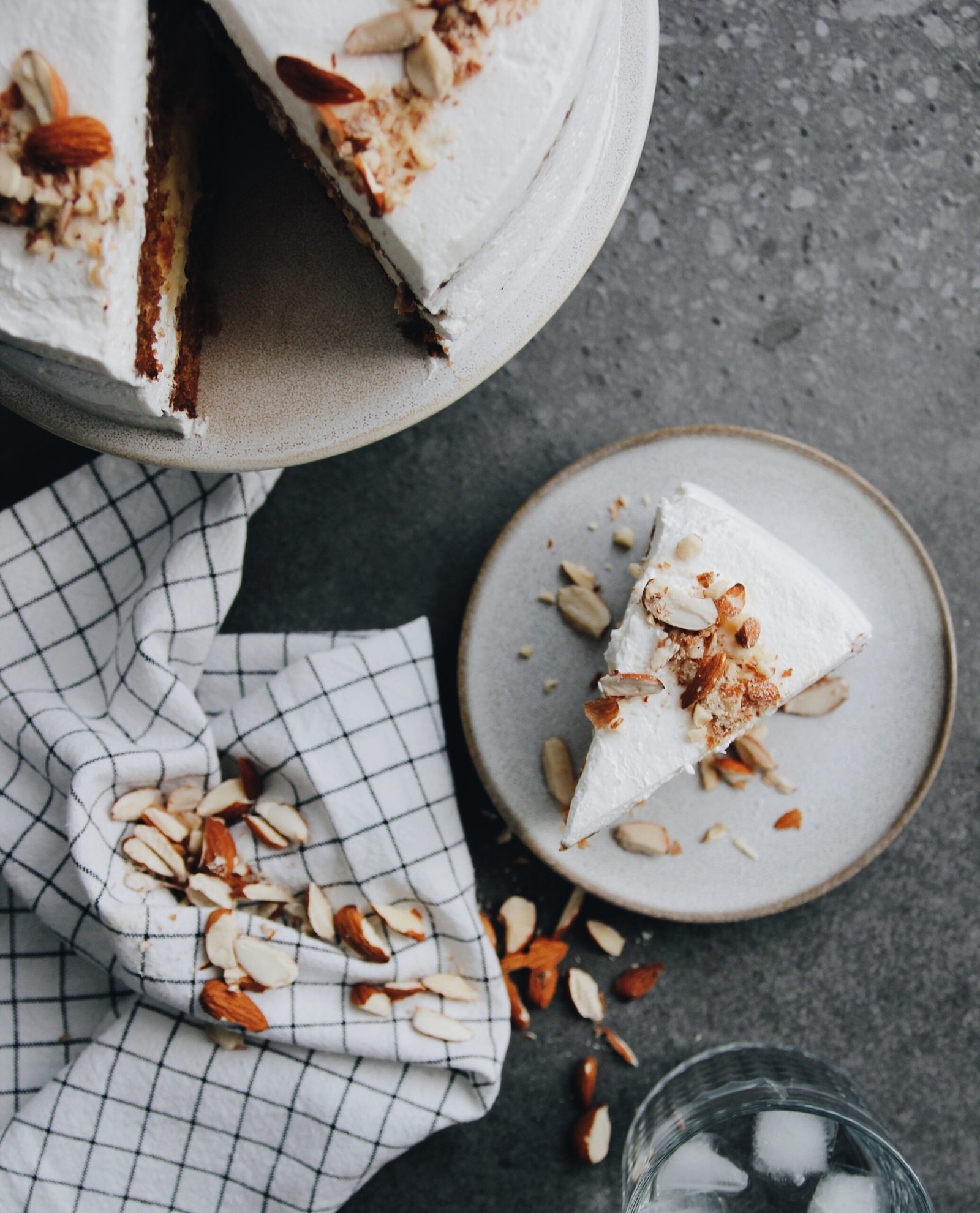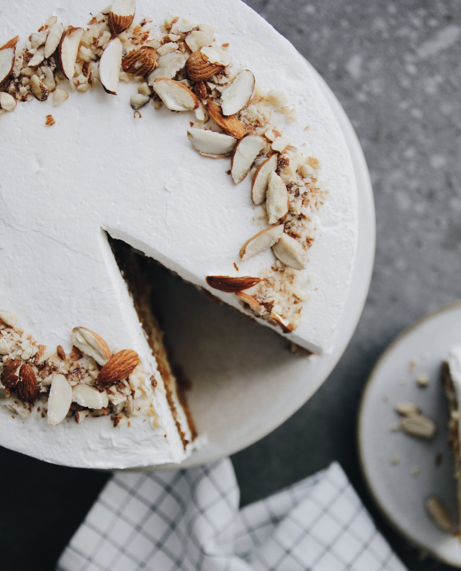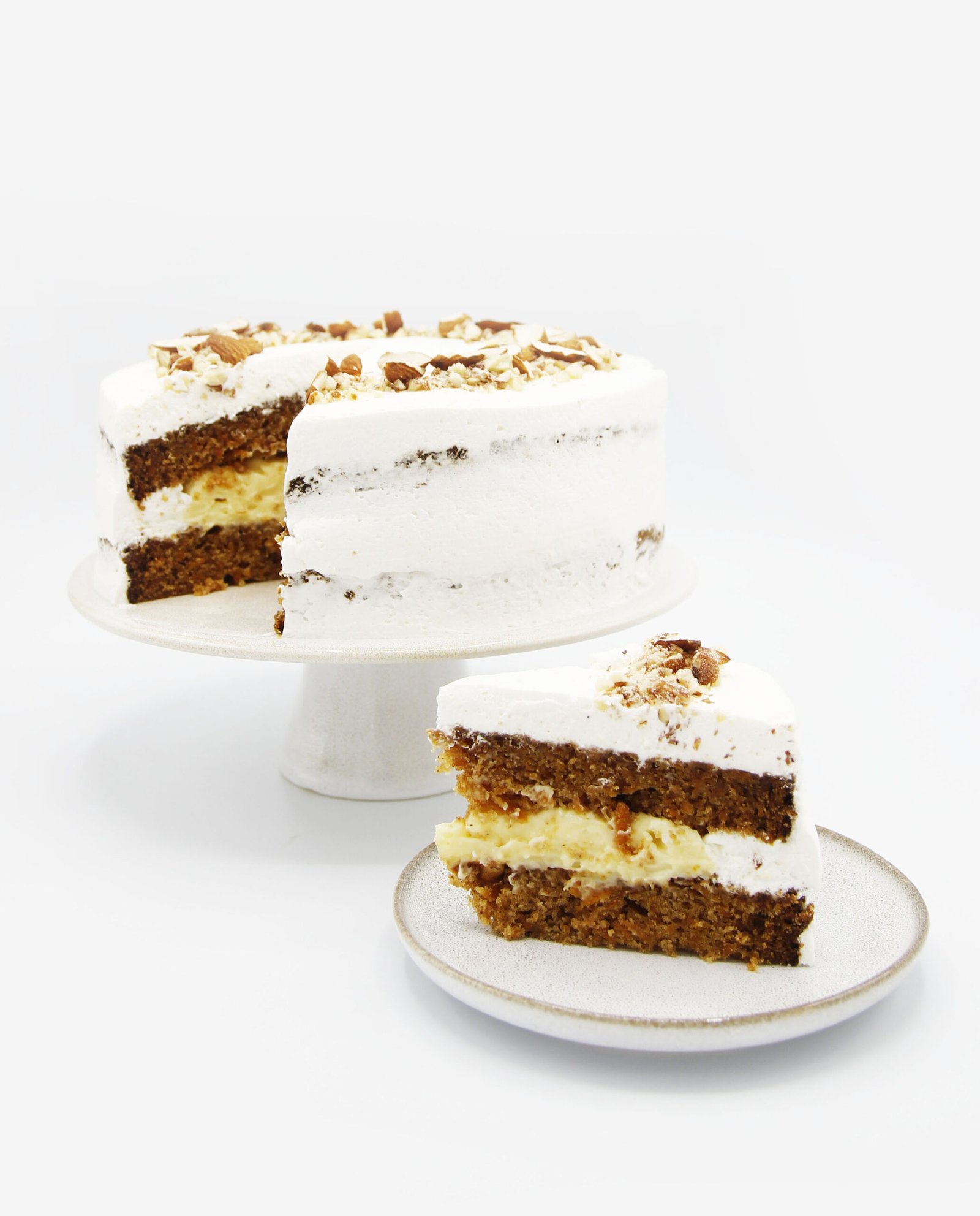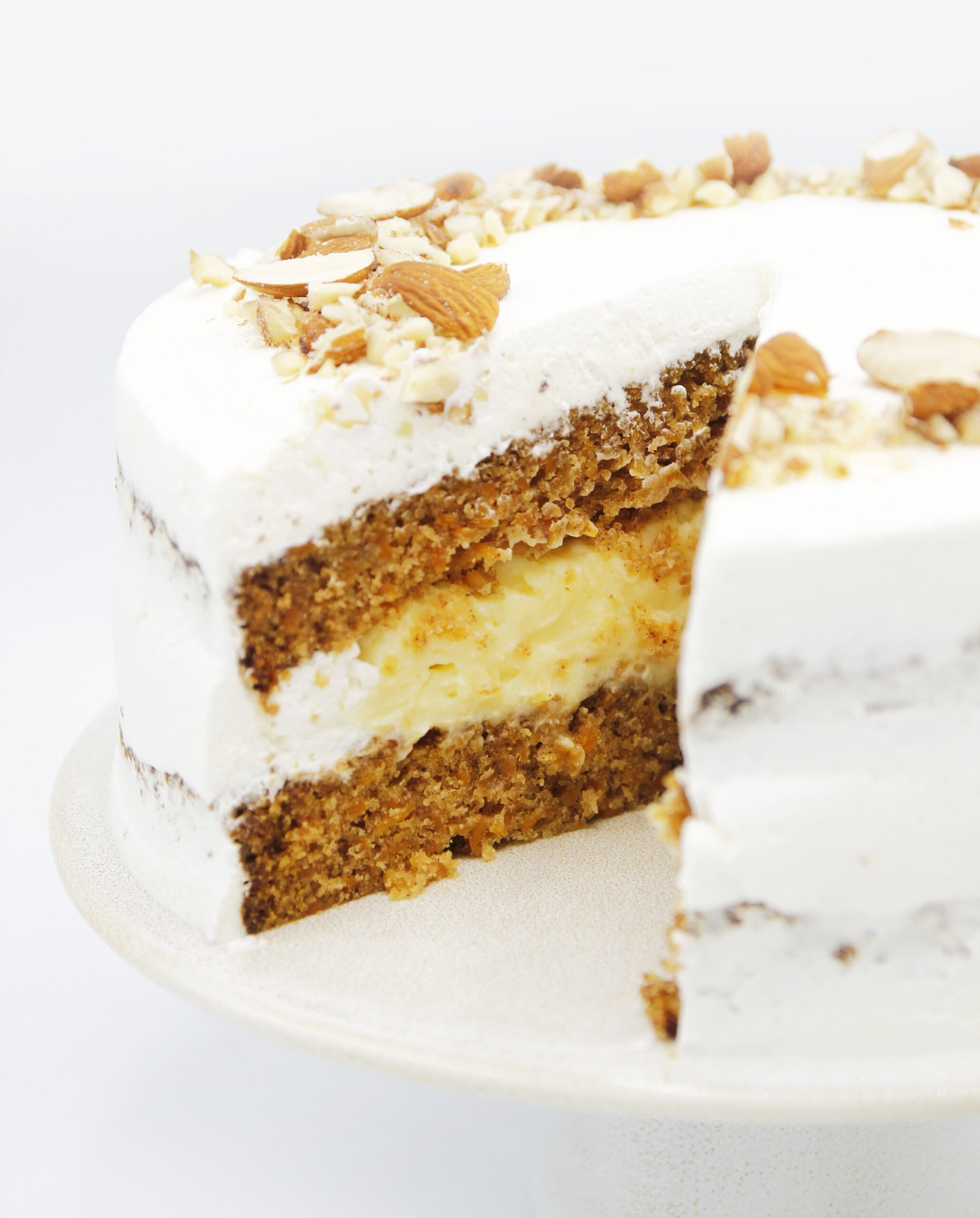Kek i butë karrote, lagur me Brandy, mbushur me kremin tonë të pudingut të vaniljes dhe mbuluar me krem vanilje mascarpone. Dekoruar me bajame.